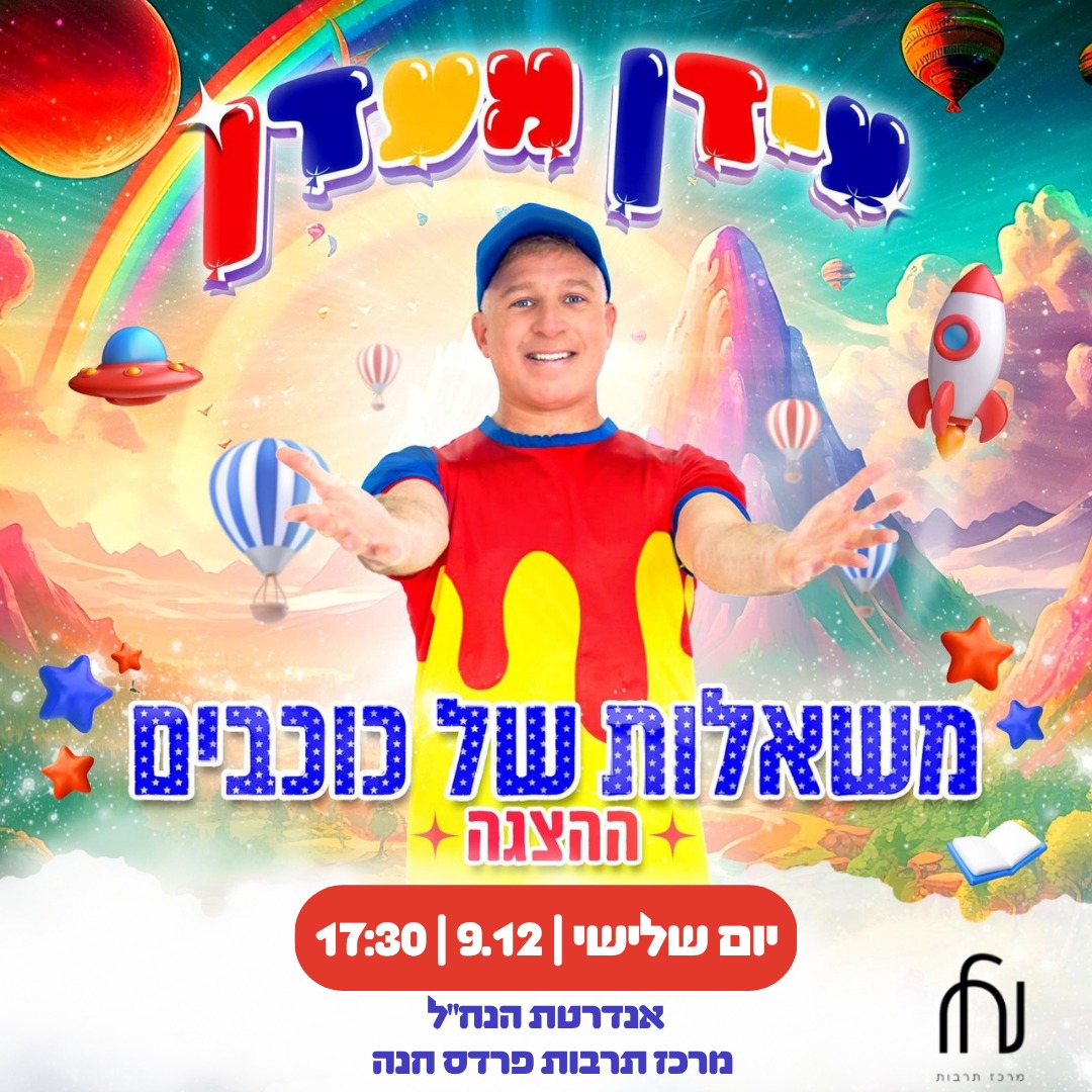 בחנוכה הזה – האור בא מהמשאלות של הילדים! עידן מעדן מזמין אתכם להצגה קסומה "משאלות של כוכבים" –מסע מוזיקלי מרגש בעולם שבו כל משאלה של ילד הופכת לכוכב שמאיר את השמיים.בדיוק כמו נרות החנוכה שמפיצים אור בכל לילה –גם הילדים ילמדו איך משאלה טובה – יכולים להאיר את הלב של...