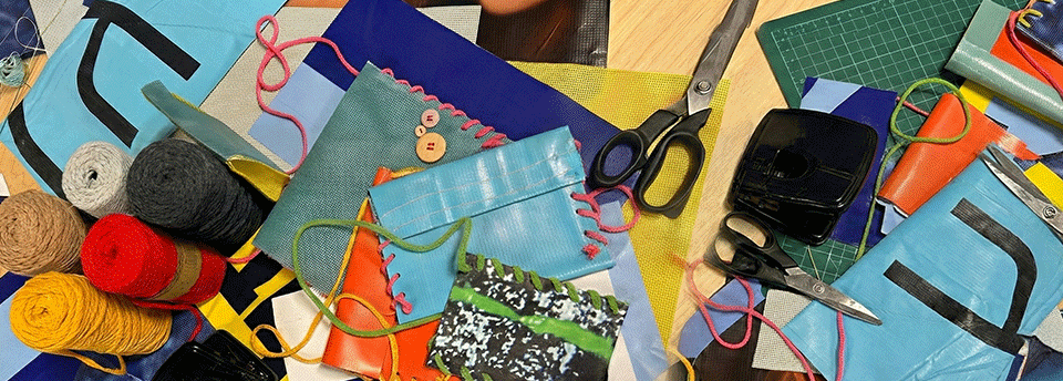 סדנת אקספרס בבית המלאכה החדש בנמל יפו – יוצרים תיק ייחודי משלט חוצות ממוחזר בעיצוב אישי. חוויה יצירתית, סביבתית וסטייליסטית שמתאימה לילדים, נוער ומבוגרים.