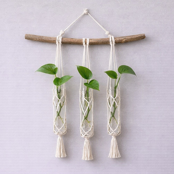 הכנת מתקן תלוי למבחנות זכוכית עם ייחורי פותוס.נלמד שיטה פשוטה של קשירה ועיטוף בחוטים טבעיים.