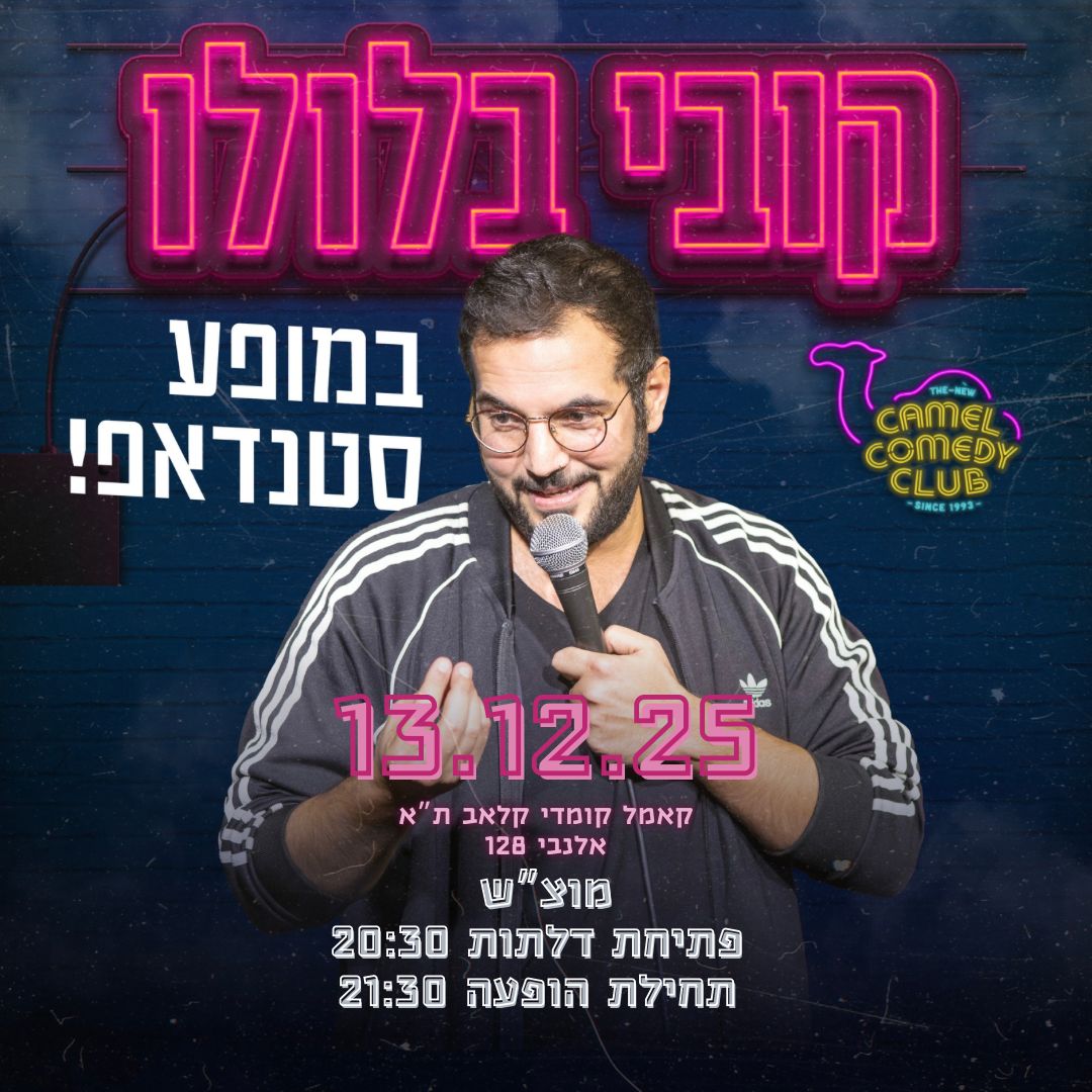 קובי בלולו הסטנדאפיסט הצעיר והפורץ מגיע לקאמל קומדי קלאב למופע סטנדאפ קורע באורך מלא!הקהל מוזמן להגיע מוקדם, לתפוס מקום ולהנות מבר משקאות ותפריט מגוון!___________________*המקומות באירוע אינם מסומנים. ההושבה היא בשולחנות בהתאם למספר הכרטיסים שנרכשו__________________________על במת הקאמל קומדי קלאב אפשר לראות מידי ערב את טובי הסטנדאפיסטים בארץ!הזמנת כרטיסים ותנאי ביטול:כתובת המייל...